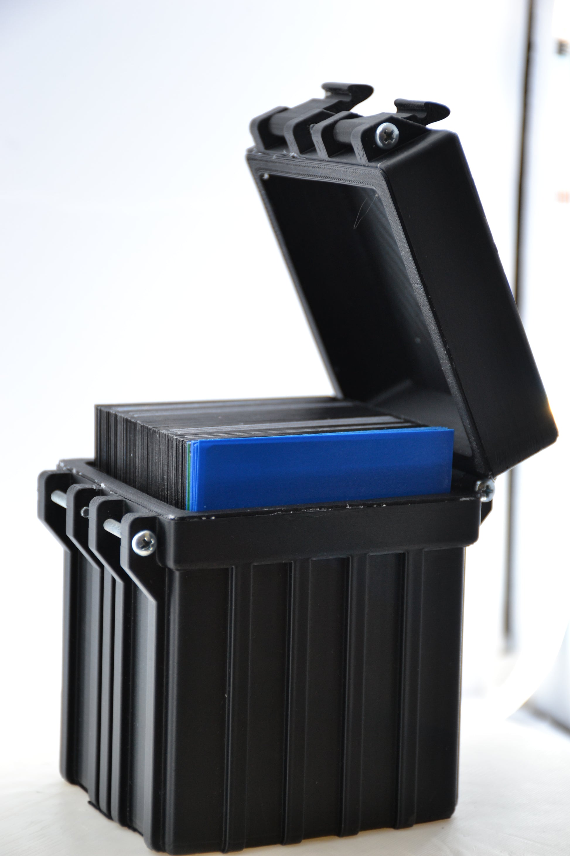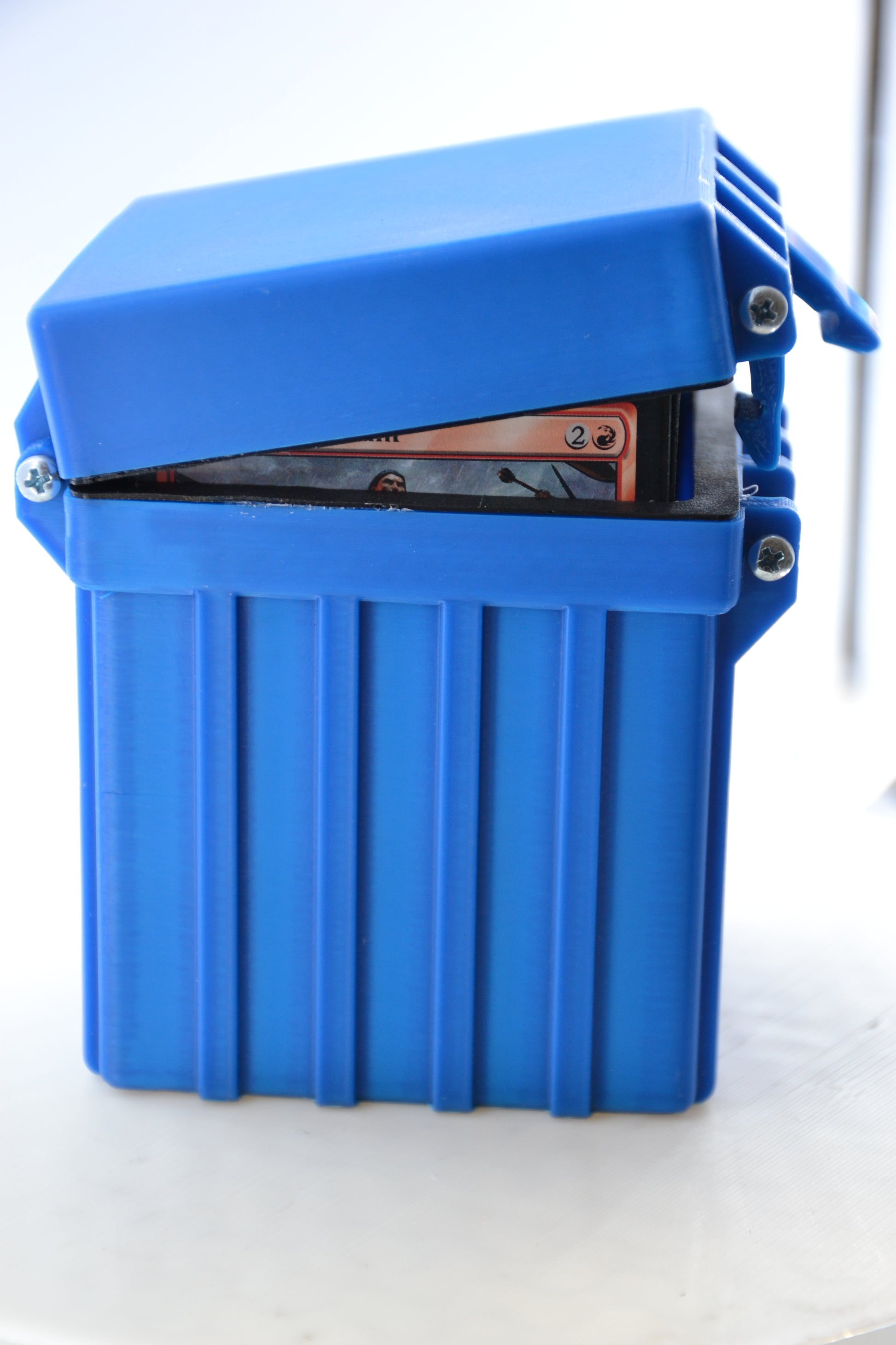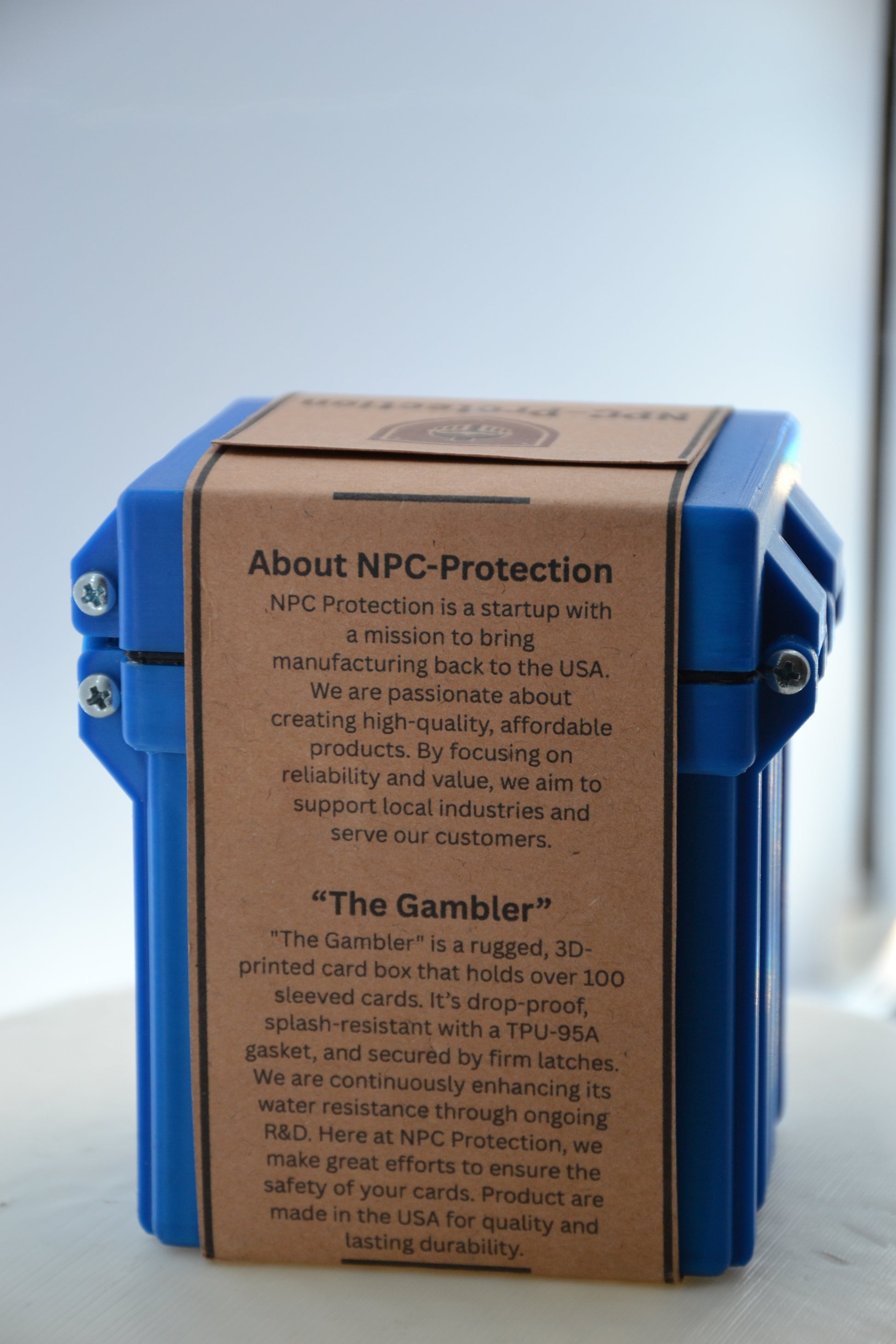 "The Gambler" is a rugged, 3D-printed card box that holds over 100 sleeved cards. It’s drop-proof, splash-resistant with a TPU-95A gasket, and secured by firm latches. We are continuously enhancing its water resistance through ongoing R&D. Here at NPC Protection, we make great efforts to ensure the safety of your cards. Products are made in the USA for quality and lasting durability.